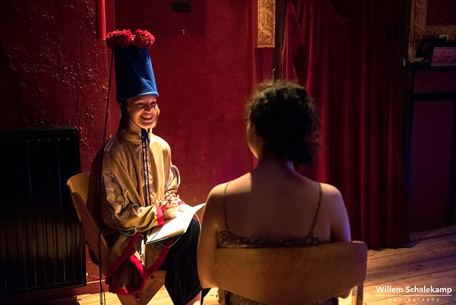 In deze intieme voorstelling laten we deze traditie herleven. Als publiekslid kies je een eigen timeslot waarin je door het geheimportaal een reis begint door het theater. Daar ontmoet je twee andere publieksleden, een Socratisch gespreksleider en drie geheimbewaarders. Eén van hen verzilvert jouw geheim tot een lied in verhullende metafoor en melodie. Deze kun je terughoren aan het eind van de voorstelling.